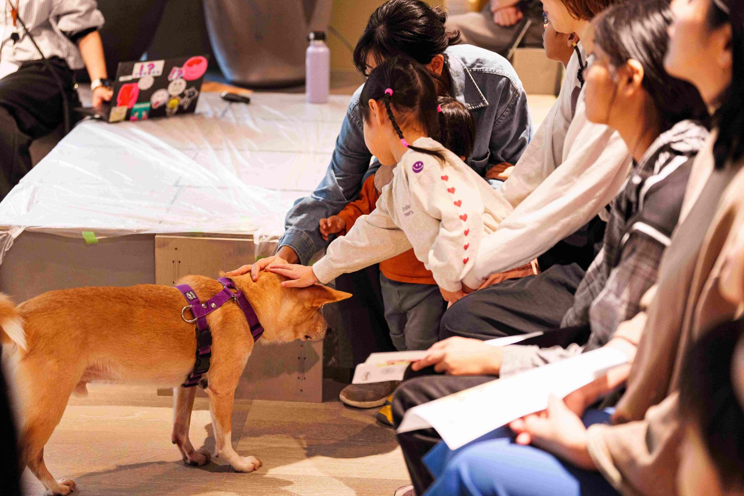 ▲スタートアップによる保護犬とのふれあい講座。この他にもワーカーのみなさまが時には保護犬たちとふれあいながら仕事ができる新しいワーク体験や、お散歩体験を通じて豊洲の街も知れる体験講座なども開催しました。